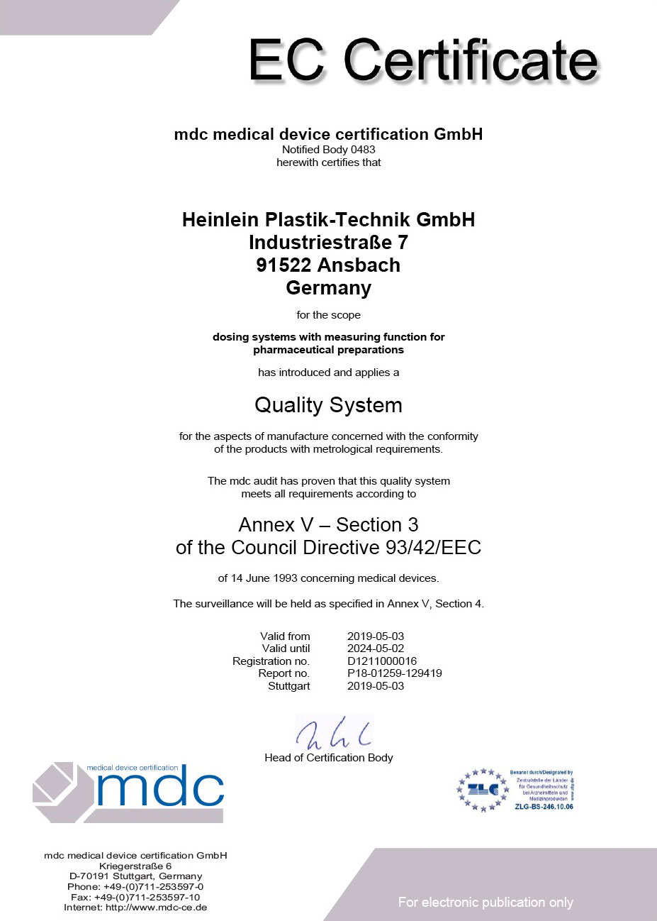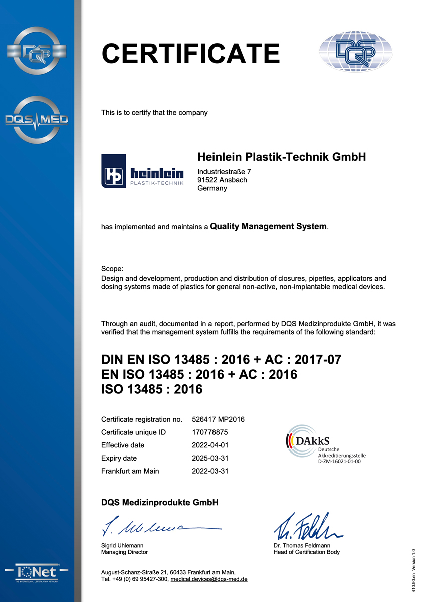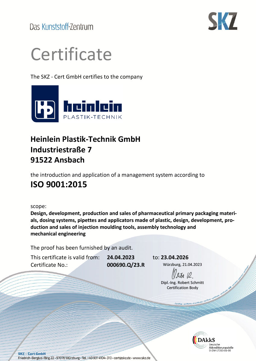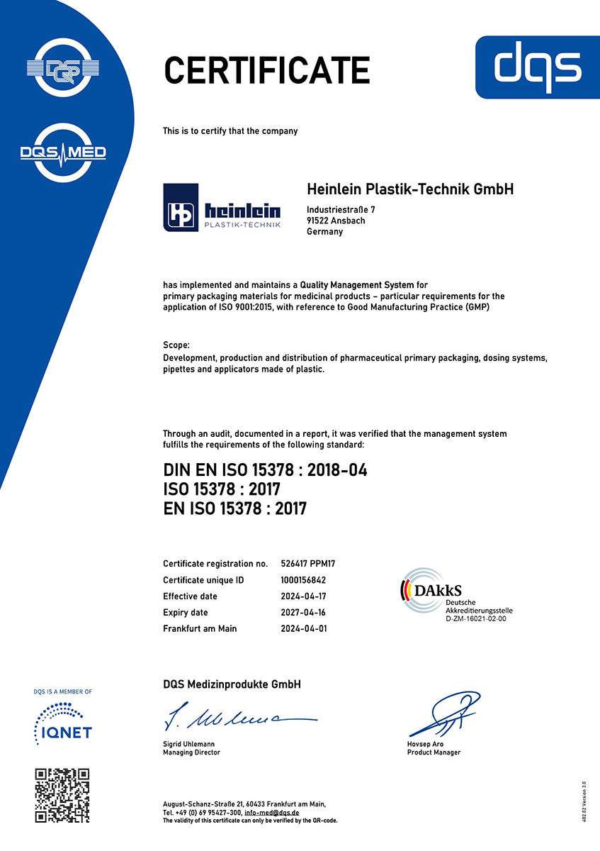 All production-relevant processes at Heinlein Plastik-Technik are documented in detail. This ensures the consistent batch tracking of all manufactured components throughout the entire value chain. All components, as well as the end product, are meticulously inspected at various points in time during the production process. They comply with the stringent requirements for pharmaceutical primary packaging. Manufacturing, assembly, and packaging take place under the highest hygienic conditions. The Heinlein management system is certified according to the international standards ISO 9001, ISO 13485 and ISO 15378. Our predominantly international customers can always be assured of the procedurally and hygienically sophisticated manufacture, assembly, and packaging of the primary packaging materials, which takes place under controlled conditions.